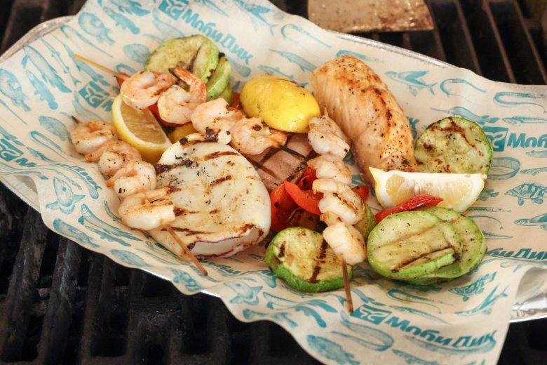 Морепродукты с овощами на гриле Морепродукты с овощами на гриле